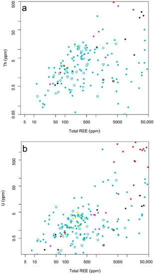 The U/total REE (Figure 7b) of the EURARE samples shows that high U contents (U > 400 ppm) are typical of REE mineralization hosted in granitic pegmatites. An additional few samples collected from magnetite-calc silicate skarn type deposits show higher contents of U (>1000 ppm). In the sample from magnetite-calc silicate skarn, one sample shows a high content of total REE correlates with high U content which may indicate the U enrichment in REE-bearing minerals.