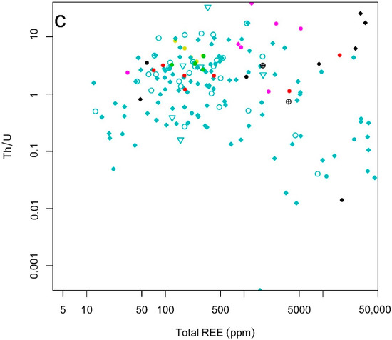 Thorium and uranium content and their ratio are useful for recognizing geochemical facies and also the content of radioactive elements in different types of mineralization which may have an impact on future exploitation. Figure 7a shows Th content versus total REEs. In general, skarn and iron oxide-apatite mineralizations with higher contents of total REEs (REEtot > 1%) show a positive correlation with low contents of Th (Th < 50ppm). A few samples from iron oxide mineralizations show higher content of Th up to 200 ppm and total REE contents of up to 3.5%. Two samples of granitic pegmatites show higher contents of Th, whereas those of total REEs are low, which means that the content of Th in those samples is not directly related to REE-bearing minerals and may also correspond to the primary origin of the host rocks and its later deformation. For example, rocks with sedimentary origin have usually higher Th/U ratios than magmatic rocks, and these ratios can be further modified during regional metamorphism [11,12,49].
