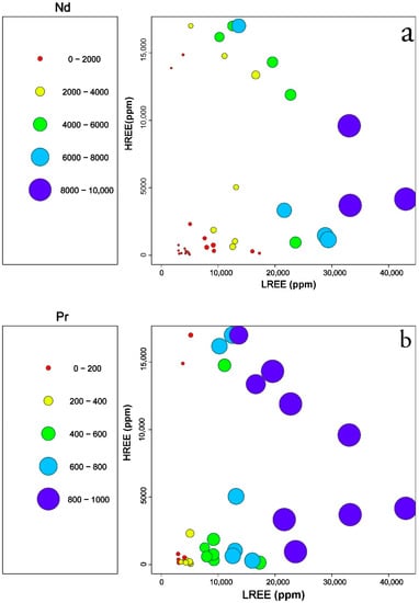 In a similar type of plot, quantitative content of Pr in the samples shows a semi-concordant trend with Nd, and this may reflect that the minerals bearing Pr and Nd are the ones containing HREE, such as xenotime-(HREE) and fergusonite-(HREE) as well as gadolinite-(REE).