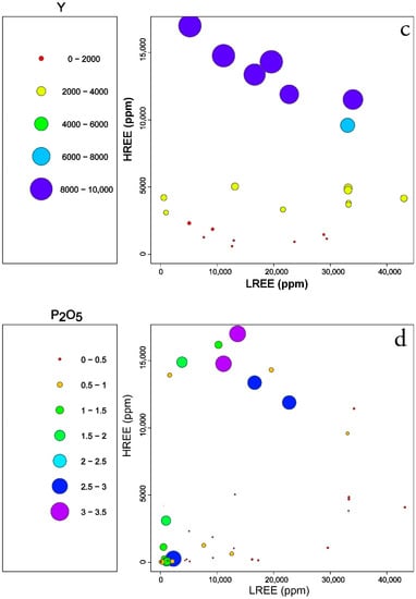 Plots of quantitative values of selected elements compared to LREEs and HREEs in the EURARE samples: (a) Nd (ppm); (b) Pr (ppm); (c) Y (ppm); (d) P2O5 (wt%). Samples with contents less than background values are excluded.