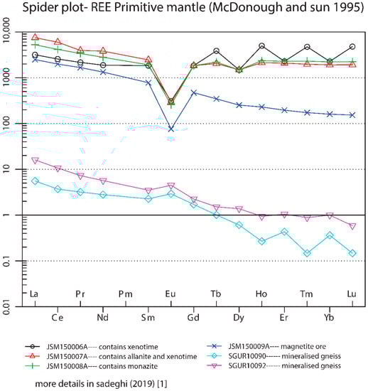 Within the sample set collected during the EURARE project, there are several iron ore samples (Fe-ore unspec.) that cannot be easily classified (more mineralogical and petrological investigations are needed). In an attempt to classify them, the classical PM-normalized REE diagram has been used [37] (McDonough and Sun 1995) (Figure 9). At a first glance, their REE patterns suggest the presence of two genetic groups. The first group with REE enrichment (>100 ppm) shows a similar trend to the iron oxide-apatite- and skarn-type REE mineralizations, with a negative Eu anomaly and relative HREE enrichment. The second group shows a weak positive Eu anomaly and steep decreasing trends from LREEs to HREEs accompanied by a rather low total of REEs (<100 ppm). These two samples may have an alkaline or peralkaline origin but a more detailed study is needed (Figure 9).