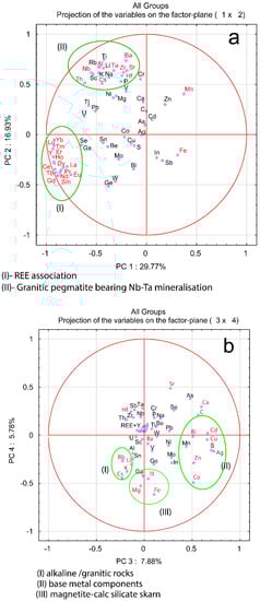 Plots of pairs of PCs show that it is likely possible to distinguish between some different types of REE mineralization or to distinguish between samples with a higher content of REEs and those with low one (Figure 10). For example, in the plot of PC1 versus PC2 (Figure 10) there are several clusters representing an association of REEs and granitic pegmatite bearing Nb-Ta mineralization. A plot of PC3 versus PC4 distinguishes between REE mineralization associated with magnetite calc-silicate skarn, alkaline, and/or granitic rocks and polymetallic mineralization (Figure 10).