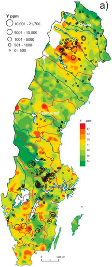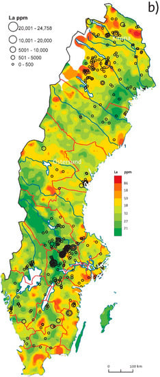 Geochemical maps comparing till geochemistry (raster, after Andersson et al., 2014 [3]) with lithogeochemistry (circle symbols) in Sweden: (a) Y in till and bedrock; (b) La in till and bedrock.