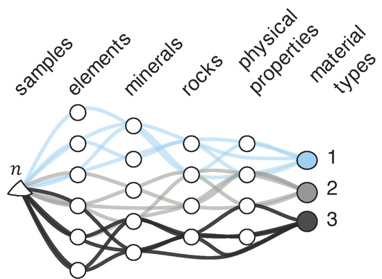 Currently, many material attributes are measured to characterise the material and classify ore or waste types. The chemical bonding or individual elements that the material is composed of cause the main differences between different material types. The way that those elements are formed and bonded together depending on the structure gives different minerals. The combination of these particular minerals gives rocks, and various combinations of rocks or lithologies give ore or waste [15]. This composition of one sample by its material attributes is represented by the pathways (lines) in Figure 2 and shows how n samples are separated into three different material types (1, 2, 3). The white circles represent the presence of a measured elemental concentration of the samples (e.g., Al, Na, Au, Mg), found minerals (e.g., biotite, chalcopyrite), rock classification (e.g., granite, dolerite), or physical properties (e.g., shape, hardness, grain size). Pathways of the same colour represent how one material type has different constitutive attributes which could characterise this material type and distinguish it from others. Therefore, different material types can be characterised by combinations of attributes, and all available attributes are not necessarily needed to identify a material type. For instance, the absence of a considerable Au concentration helps to classify waste material and, therefore, such a sample does not necessarily need further analysis of the rock and physical properties.