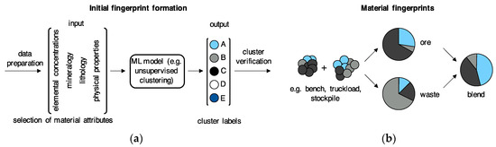 (a) An example where initial fingerprint formation is done through unsupervised clustering. Clustering generates potential cluster or class labels and may act as training data input for another machine learning (ML) model which can characterise new fingerprints from measured material attributes; (b) An example where three (A, B, C) class outputs are used to explain proportionality of classes. The proportionality of classes allows the formation of fingerprints which characterise ore, waste, or blend types.