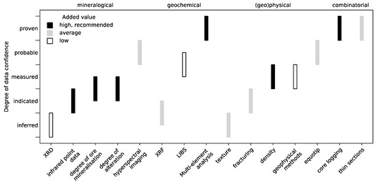 The ranges are based on confidence in the quality, quantitative nature, robustness, and representativity of the data. The box colour is based on two things: (1) the added value of this data to an already existing fingerprint classification, and (2) the type of information that is useful for predicting the behaviour of mineral processing. The added value of a dataset may be high and recommended, average, or low. For example, X-ray diffraction (XRD) measurements are done on a relatively small sample with time-consuming sample preparation. Afterwards, it is possible to infer properties (quantitative mineralogical interpretations) for particular minerals via Rietveld analysis [21]. Therefore, XRD datasets resemble an inferred degree of confidence. A single infrared or XRF dataset will only give inferred or indicated material properties. Although the samples are measured with high precision, their representative spot size is small. Moreover, further interpretation of the spectra is necessary to make use of the result. Nevertheless, adding an infrared or XRF dataset to a fingerprint built based upon a multi-element and core logging dataset (of proven confidence) adds value. This could, for example, show the lines between geochemistry and mineralogy, because the given elemental concentrations from multi-element analysis relate to the minerals found within the XRF results (the minerals are composed of these elements).