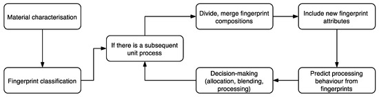 Flowsheet on how the hybrid fingerprint character allows for changes in the fingerprint composition during the unit processes of a mine and allows for better decision-making.