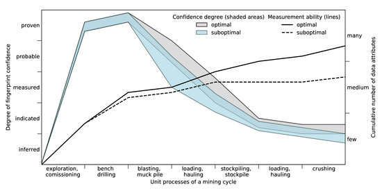 The emphasis is on describing the type of available data in each unit process of a mining cycle, as well as on the impact of different processes on fingerprint confidence. The goal is to show how the degree of confidence of fingerprints plays a key role during a mining operation. Figure 6 shows, for each unit process, indicative estimations of the expected degree of the fingerprint confidence and the cumulative number of data points, which describe the fingerprint attributes. A confidence region (coloured shaded area) indicates the degree of confidence, and it increases or contracts in height based on the confidence at each unit process and optimality scenario. A suboptimal and an optimal scenario are shown in Figure 6. The difference in these scenarios results from the capability of incorporating sensing techniques. Here, optimal refers to a scenario where the mine minimises energy consumption and maximises recovery by understanding the material fingerprints. On the other hand, a suboptimal scenario relates to a limited use or acquisition of sensor data to understand material attributes. The confidence degrees of the suboptimal and optimal scenario may overlap with each other.