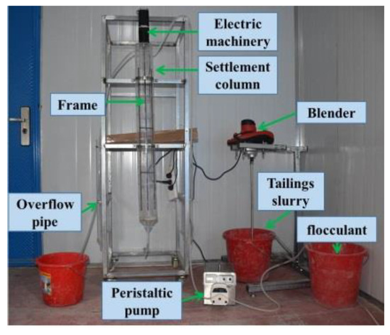 The settlement cylinder is 10 cm in diameter and 50 cm in height, with a four-picket rake. The rake rotation speed is adjustable, and the rake torque can be detected by sensors to simulate the thickener operations. The test platform is shown in Figure 2.