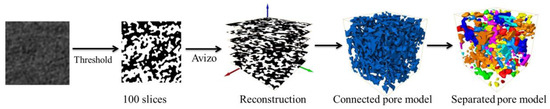 The pore size distribution (PSD) is widely used in pore morphology research of porous media [36]. The system noise in the original CT images needs to be filtered with ImageJ and Avizo software (Version: 2019.1), which can eliminate noise while maintaining the image details. The image binarization process divides a gray image into a target and background via an optimal threshold. In this study, the threshold of each image group is 121. Only black and white colours occur in the final binary image, where the black colour represents the pores, and the white colour represents the tailings material. These two-dimensional binary images are combined in a certain order to obtain the three-dimensional (3D) image of the tailings pores. Separated and connected pores can be extracted from the 3D reconstructed model. The reconstruction process and analysis method are shown in Figure 3.