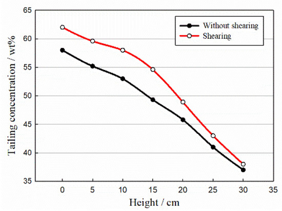 In the continuous thickening tests, the concentration of the feed slurry is 10 wt %, the bed height is 30 cm, and the residence time is 34 min. The average concentration of the tailings bed without shear is 50.10 wt %, the underflow is 58 wt %, and the concentration of the top layer is 37 wt %. At a stirring speed of 2 r/min, the average concentration of the tailings is 55.82 wt %, the underflow concentration is 62 wt %, and the top layer concentration is 38 wt %. The average concentration of the tailings with shear is 11.42% higher than that of the tailings without shear.