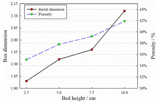 (3) The pore size and fractal dimension increase with the bed height. The average pore volume increased from 2.183 × 105 to 3.249 × 105 μm3, and the fractal box dimension increased from the range 1.8~1.95 to the range 2.1~2.15 as the bed height increased from 2.5 to 10 cm. The sealed-water storage space increases with the pore shape complexity.