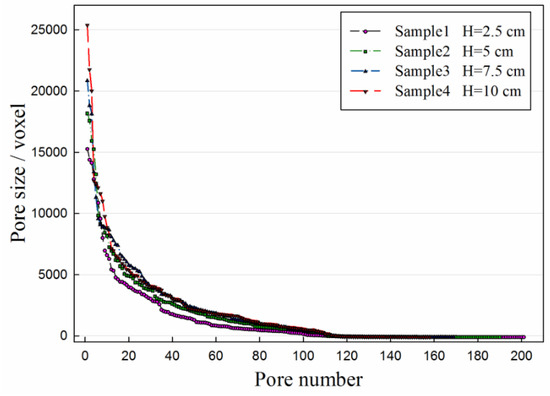 The quantity of pores decreases with increasing bed height. As shown in Figure 7, the pore quantity decreased 6.97%, 10.16% and 5.95%. The reduction occurs due to the poor connectivity between the pores at the bed bottom. The isolated pores sealed in water in the network structure. There are larger but fewer pores at the top of the bed, forming longer and large-diameter flow channels for sealed water-drainage.