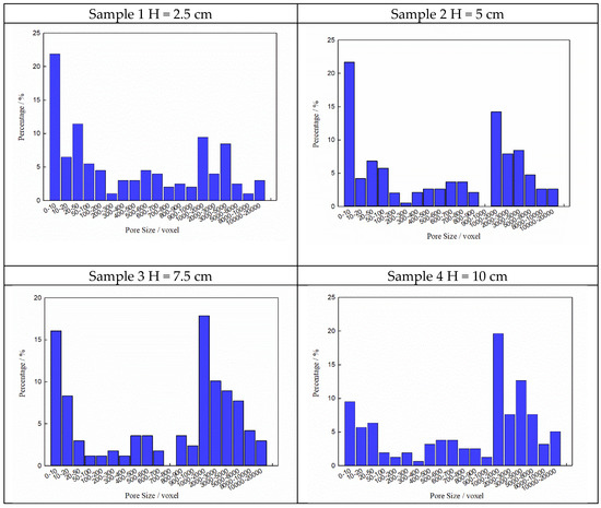 The pore volume distribution in the compression tailings bed is shown in Figure 9. The small-size pore quantity decreases, and the large-scale pore content increases with the bed height. At 2.5 cm in the bed (from the bed bottom), the number of pores smaller than 1.25 × 104 μm3 (voxel = 100) accounts for 45.27% of the total number of pores. The pores larger than 2.5 × 105 μm3 (voxel = 2000) account for 18.92% of the total pores. Correspondingly, at a height of 10 cm in the bed, the number of pores smaller than 1.25 × 104 μm3 accounts for 23.42% of the total pores, and the number of pores larger than 2.5 × 105 μm3 accounts for 36.06% of the total pores. The pore volume distributions are quite different. The tailings sedimentation state gradually changes from a dense state to a loose state.