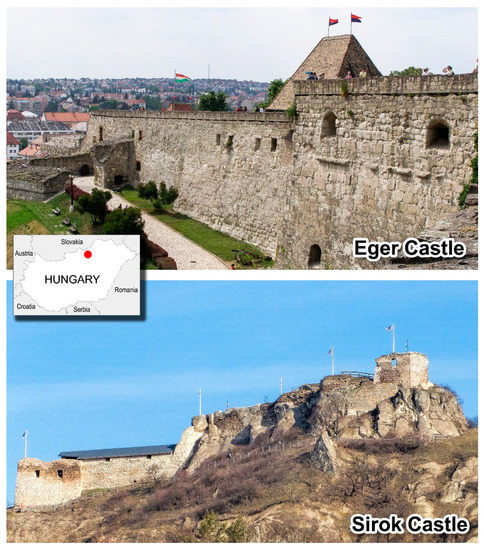 The castles of the town of Eger and the village of Sirok (Heves County) represent the grandest examples of monumental architecture made almost exclusively of those local stones (Figure 1). Eger Castle was built from 1248 to 1261 from the ruins of a preexisting fortification destroyed during the Mongol invasion. It went through several modifications and reconstructions until the 18th century when it lost its military defensive role. The castle’s name is linked to a battle fought in 1552 by a Hungarian garrison of 2000 units, who triumphed over a massive Ottoman army, sieging with 80,000 soldiers. The structure today appears fully integrated in the modern urban fabric. Sirok Castle was also built in the 13th century, about 15 km from Eger, and had a complex history of renovations and reconstructions. It was a private residence for local lords, then reinforced in the 16th century with a bastion fortification, in the attempt to halt the Ottoman advance. The last major damages were committed by the Habsburgs, who blew up and partly destroyed the castle in 1713 after the unsuccessful Rákóczi’s War of Independence. The fortification towers above the village, isolated on the top of a hill.