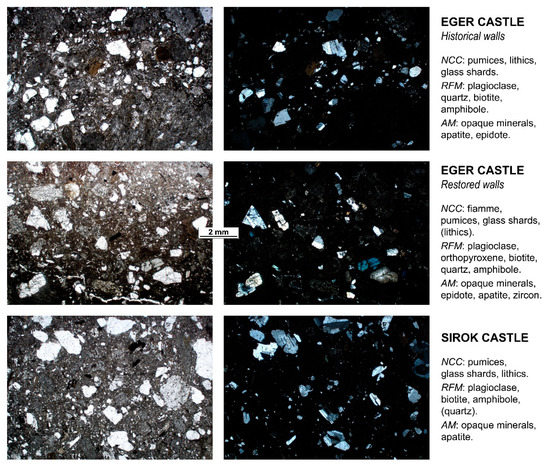 The petrographic study helps identify the quarry sources of the three tuff varieties [11]. The tuffs of the historical walls of Eger Castle come from the nearby quarries of Demjén or Eger, whereas those of the restored walls from the area of Bogács, a few kilometers apart. The provenance of the tuff of Sirok Castle is the hill itself where the structure was built, or the nearby outcrops. In those locations, the rock composition (bulk and of juvenile components) is mostly dacitic [33].