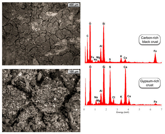 Soiling and black crusts contribute to the most typical discolorations, produced by the deposition and cementation at different degrees of blackish C particles (Figure 4). These crusts frequently have mid-high levels of Cl and a variable extension. In Eger Castle, they reach the greatest thickness, exceeding 100 µm. This is consistent with the more polluted environment of a larger town like Eger. There, motor vehicle exhaust emissions–typically composed of spherical C particles, coated with NOx, VOC, sulfates, metals, etc. [41,42,43]–are supposedly more abundant, even more so considering that a major road runs just 20–30 m from the castle walls. Likewise, a railway runs a few meters away, between the road and the castle, so that the steam and, later, diesel locomotives in transit since 1908 represent a further source of soot.
