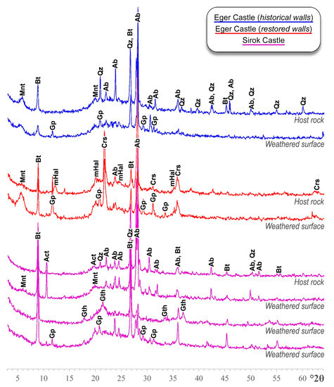 The occurrence of gypsum is determined at different degrees, from a general sulfation of the tuff surfaces to the presence of discrete discernible crystals (Figure 4). Their grain size is the largest in Eger Castle. The XRD results indicate that gypsum is the secondary phase most frequently detected (Figure 5). Nevertheless, it is often finely dispersed on the stone surface, without forming compact aggregates of coarse-grained crystals. This last observation is explained by the low air concentration of SO2 (about 7 µg/m3, Table 1), typical of a rural environment [44], and the lack of a major intrinsic source of Ca. CaO concentration in the studied tuffs is typically below 3% [33], so that the plausible source is external and represented by lime-mortar joints, from which CaCO3 dissolves and then reprecipitates. The role of mortars in gypsum formation on volcanic rocks has been already postulated in the literature [43,45,46], although some studies indicate the possible contribution of the rock-forming minerals, e.g., calcic plagioclases [15,47]. Generally, the possible role of wind-blown carbonate grains, from loess or calcite-rich rocks, needs also to be considered [48,49].