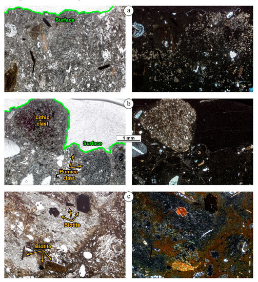 Finally, it is worth mentioning a weathering pattern observed more frequently at Sirok Castle, i.e., orange patinas mainly constituted of goethite (Figure 5). This phase might derive from the leaching of Fe-bearing minerals and subsequent Fe mobilization [43], especially from biotite–which releases Fe2+ from the octahedral layers–or the basaltic-andesitic lithoclasts [29]. Another source might be the glassy matrix that, during hydration, is subjected to the strong oxidation of the Fe contained therein [54]. In fact, an enrichment in Fe oxides and hydroxides was observed nearby biotites and in the matrix, spreading out following the pore channels and penetrating into the pumice clasts (Figure 6c). This was also in agreement with the higher biotite concentration in Sirok tuff, estimated by XRD (Table 2), which exceeds 50% in some samples.