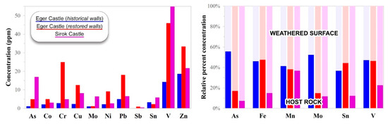 The ICP-MS analyses of the non-silicate fraction of crusts, patinas, and deposits on the tuff surfaces, as well as of the host rock, allow outlining the concentration patterns of trace elements. The most interesting data are related to heavy metals (Figure 7). Generally, compared to the bulk stone, the weathered surfaces are noticeably richer in As, Co, Cr, Cu, Fe, Mn, Mo, Ni, Pb, Sb, Sn, V, and Zn. The absolute maximum concentrations for some illustrative elements are: As 40 ppm, Cr 28 ppm, Cu 48 ppm, Ni 28 ppm, Pb 89 ppm, V 135 ppm, Zn 79 ppm. The lowest and highest average concentrations are both detected at Eger Castle, on the historical and restored walls, respectively. As for the balance of trace-element concentration between the surface and the host rock, the historical walls of Eger Castle report the lowest decrease of heavy metals in the inner layers, i.e., less than 30% on average: for instance, Fe is 10,027 ppm on the surface and 8579 ppm underneath, instead Pb is 5.6 ppm versus 4.3 ppm. On the contrary, the other tuffs record mean differences between 45% (Eger Castle) and 55% (Sirok Castle), pointing out that the accumulation of those trace elements is mostly superficial.