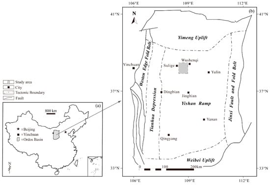 Location of the study area showing in the tectonic map of Ordos Basin. (a) Geographic location of the Ordos Basin; (b) geographic location of the study area.