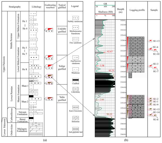 Schematic diagram of sampling location. (a) Generalized stratigraphic columns of the Shihezi Formation (modified from reference []); (b) sampling depth and its corresponding logging profile and gamma (GR ) curve.