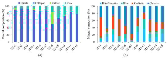 Mineral composition bar chart of He 8 Member tight sandstone. (a) Total rock mineral composition bar charts; (b) clay mineral composition bar charts.