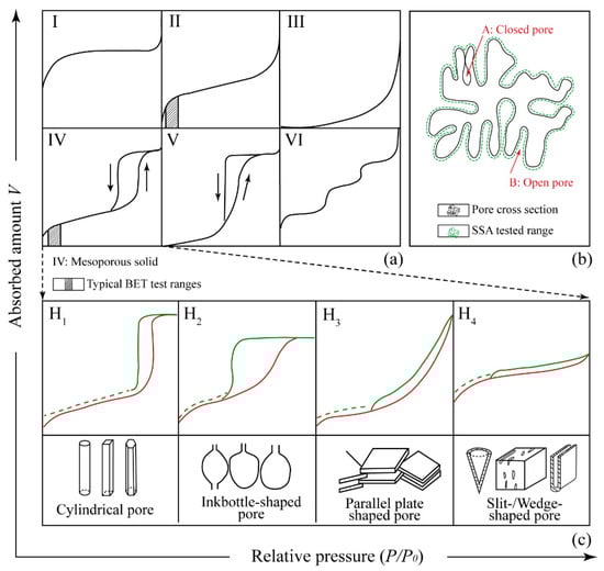 Type of adsorption isotherms and its corresponding pore types: (a) Type of adsorption isotherms; (b) specific surface area (SSA) tested range by Brunauer-Emmett-Teller (BET) test; (c) hysteresis loops and its corresponding pore shapes.