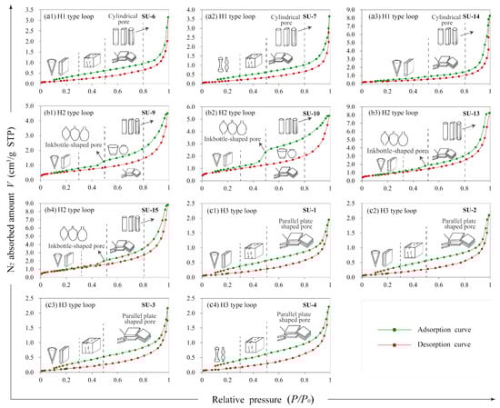 For type H2 represented by SU-9, SU-10, SU-13, SU-15, the inflection point visible in the desorption curves appears around P/P0 = 0.5, which developed a wider hysteresis; this indicates the morphology of mesopore-I present a fine bottleneck with one side almost closed or double side open []. In addition, parallel plate–shaped pores and cylindrical pores usually appear in combination among these samples.