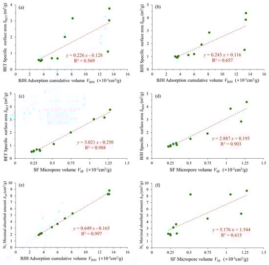 Univariate linear regression analysis of pore structure parameters: (a) Relationship between VBJH and SBET; (b) relationship between VBJH and SBJH; (c) relationship between VSF and SBET; (d) relationship between VSF and SBJH; (e) relationship between VBJH and AM; (f) relationship between VSF, and AM.