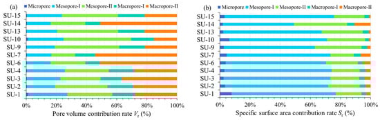 The contribution rate of VBJH and SBJH in five different size ranges pores. (a) Pore volume (PV) contribution rate of five different size classes pores; (b) specific surface area (SSA) contribution rate of five different size classes pores.