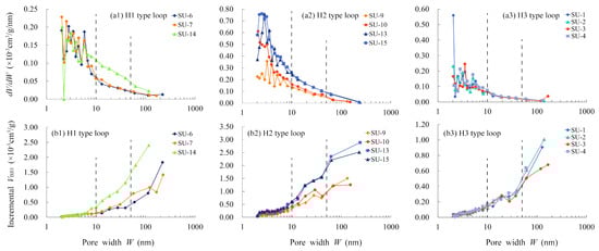 Representative pore size of different hysteresis loop types tight sandstone: (a1)–(a3) dV/dW vs. PW, (b1)–(b3) Incremental VBJH vs. PW.