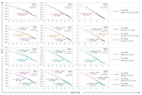 In this study, different piecewise linear fitting methods were used by selecting five different relative pressure (P/P0) cutoff value, the ln(V) vs. ln[ln(P0/P)] curves could be separated into two or three segments. The fractal fitting curves of three typical samples are illustrated in Figure 9, where the slope (k) was used to calculate fractal dimension value (DN) according to Equation (1) and Equation (2), using calculated root mean square error (R2) to show the fitting degree. As presented in Table 3, DN calculated by all four methods exhibit good fitting with R2 values that are mostly higher than 0.97, and the calculated results are shown in Table 4.