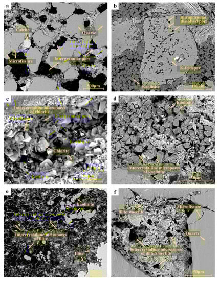 The heterogeneous distribution of mineral particles constitutes a diversiform pore-throat system. FE-SEM images show that pore types of all tight sandstone samples consist of different mineral edge can be classified into four types: original intergranular pore (Figure 10a), secondary dissolved intragranular pore (Figure 10b), intercrystalline micropores of clay minerals (Figure 10c–f), and microfissure (Figure 10a).