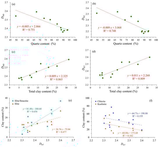 Quartz is the highest mineral composition in all tight sandstone samples according to the X-RD results (Table 1 and Figure 3) and FE-SEM images (Figure 10a). Therefore, it is extremely important to point out the relationship between quartz and DN. The result shows that quartz content is showing a good negative correlation with all types of fractal dimensions respectively, which DN0 and DN2 showing the best correlation with quartz content (Figure 11a,b), with correlation coefficients of 0.751 and 0.748. A higher quartz content indicates the pore-throat system tend to be simpler, which is contrary to the relationship between total clay mineral content and DN (Figure 11c,d), with a positive correlation coefficient of 0.865 (DN0) and 0.809 (DN7). This is associated with the extensive distribution of clay minerals and its complex composition, which provides a large amount of nano-scale storage space for the occurrence of tight gas and makes the pore-throat system more complex at the same time.