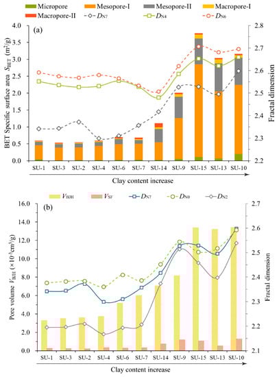 The relationship between pore structure parameter and Fractal dimensions in the order of clay mineral content increasing. (a) The relationship between SBET and fractal dimensions; (b) the relationship between PV and fractal dimensions.