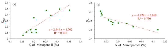 The relationship between Sr and DN. (a) The relationship between Sr of mesopore-II and DN8; (b) the relationship between Sr of macropore-II and DN1.