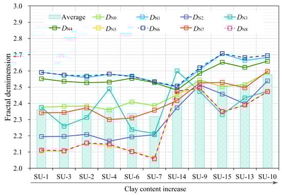 Among different types of fractal dimensions, the overall distribution of DN0, DN1, DN4, and DN6 is more concentrated, whereas the whole distribution of DN2, DN3, DN5, DN7 and DN8 is more scattered (Figure 15). This is relevant to the heterogeneity of pore structure and mineral composition, which expanded the range of fractal dimension values, in other words, this type of fractal dimensions is more sensitive to certain specific property. Correlation analysis results show that expect of DN3 showing a weak relationship with chlorite content (R2 = 0.252), which present the best correlation among all types of DN, all the “scattered” fractal dimensions is bound up with mineral content to some extent, while “concentrated” fractal dimensions is much weaker except of DN0. In addition, DN5 and DN8 merely present a good relationship with mineral content (especially in quartz content and illite/smectite content) (Figure 11 and Figure 14) and Sr of mesopore-II, which is optimum parameter to represent the complexity of mineral composition and its corresponding micropore shape.