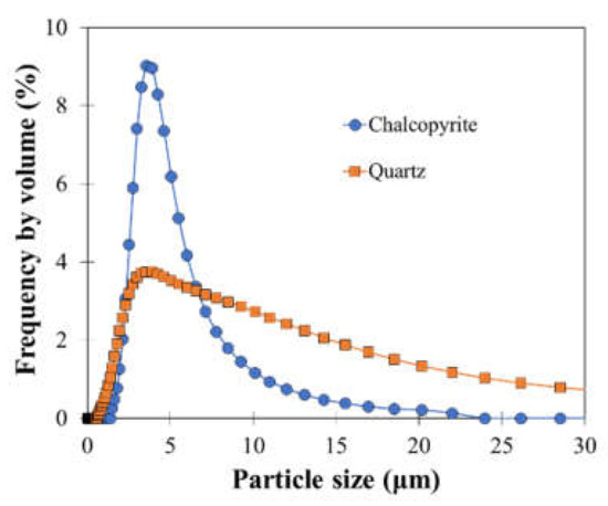 The chalcopyrite specimen was crushed using a jaw crusher (1023-A, Yoshida Manufacturing co., Ltd, Sapporo, Japan) and ground by a vibratory disc mill (RS100, Retsch Inc., Haan, Germany), then screened to obtain a size fraction of less than 75 µm. The ground sample (less than 75 µm) was ground again by the vibratory disc mill to obtain fine particles having a median particle diameter (D50) of 3.5 µm. The quartz sample (primary particle diameter of less than 500 µm) was ground separately in the same manner as the chalcopyrite sample. The median particle diameter (D50) of the quartz sample was 6 µm. The particle distribution of chalcopyrite and the quartz sample used in this study were measured in water after ultrasonication (Figure 1), using a laser diffraction machine (Microtrac® MT3300SX, Nikkiso Co., Ltd., Tokyo, Japan).