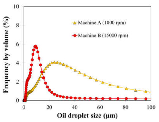 Size distribution of oil droplets in suspension (1 wt.% of kerosene and 99 wt.% of distilled water) prepared using machine A (1000 rpm) and B (15,000 rpm).
