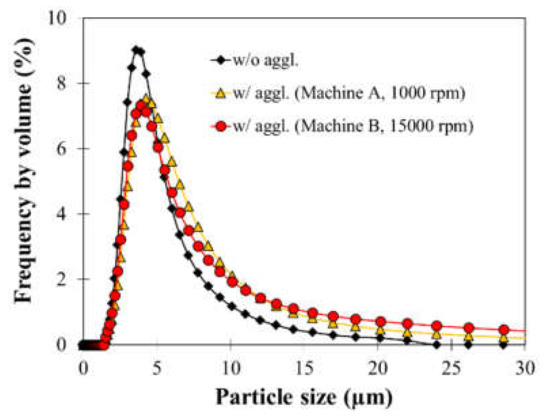 Size distribution of chalcopyrite without agglomeration and with agglomeration using machine A (1000 rpm) and machine B (15,000 rpm).