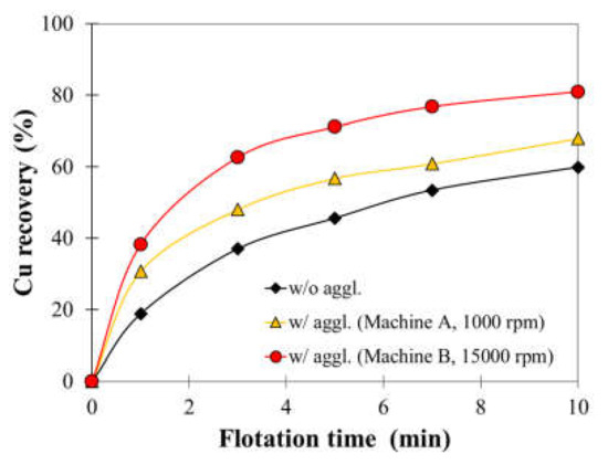 Cu recovery without agglomeration and with agglomeration using machine A (1000 rpm) and machine B (15,000 rpm).