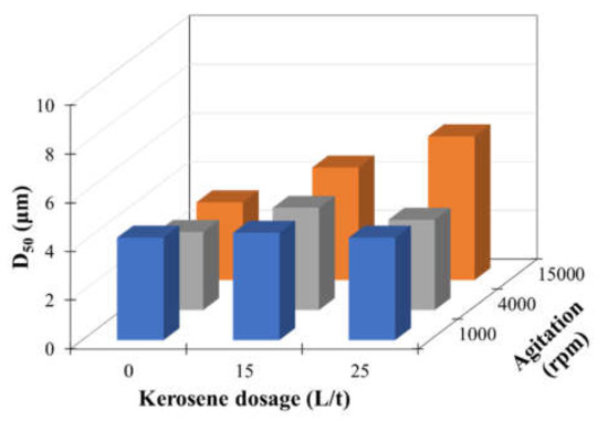 Effects of kerosene dosage and agitation speed on the median diameter (D50) of agglomerates (KAX 200 g/t). KAX—potassium amyl xanthate.