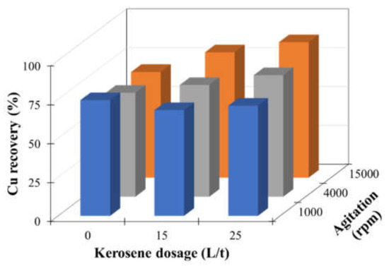 - Increasing kerosene dosage is not effective to improve Cu recovery when low agitation strength is applied, while at high agitation strength, Cu recovery is improved. High agitation strength and high dosage of kerosene provide high Cu recovery.