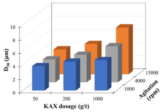 The effects of KAX dosage on agglomerate size and flotation of agglomerate were investigated under varied agitation conditions. Figure 7 shows the effects of KAX dosage on the median diameter (D50) of agglomerates. The dosage of kerosene was fixed to be 15 L kerosene/t sample. As shown in Figure 7, the median diameter of agglomerate slightly increased with increasing KAX dosage at agitation speeds of 1000 rpm and 4000 rpm, while the effect become significant at 15,000 rpm. There are two possible mechanisms of how KAX addition contributes to agglomeration: (1) increasing hydrophobic interaction between particles, and (2) an increasing attachment probability of particle and oil droplet. A chalcopyrite surface becomes hydrophobic when KAX is adsorbed on the mineral surface, and the increase in the adsorption amount of KAX may cause a strong hydrophobic interaction between particles, and thus the median size of agglomerates becomes bigger. In addition, when the mineral surface is rendered hydrophobic, the attachment probability after collision of oil droplet and mineral surface is increased, and thus the median size of agglomerates becomes bigger. These results indicate that the median diameter of agglomerate was affected not only by kerosene as a bridging liquid but also by the KAX amount as surface modifier.