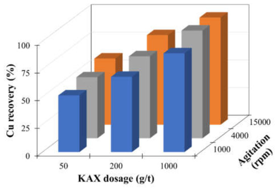 Figure 8 shows Cu recovery after 10 min flotation of agglomerate under varied agitation strength. This result shows that Cu recovery increased with increasing both KAX dosage and agitation speed. High Cu recovery at high-speed agitation with a large KAX dosage can be interpreted as a result of the larger size of the agglomerate; for example, at 15,000 rpm with 1000 g/t KAX, both agglomerate size and Cu recovery become highest. At 1000 rpm, however, Cu recovery increased but agglomerate size was slightly increased with increasing KAX dosage. In addition, as described previously, the increase of KAX addition assists the attachment probability of oil droplet and mineral surface, resulting in the number of oil droplets attached to the mineral surface increasing, which improves the hydrophobicity of agglomerate even where the median diameter shows similar values. Thus, Cu recovery could be significantly increased, although the median diameter of agglomerate was slightly increased with increasing KAX dosage (Figure 7 and Figure 8).