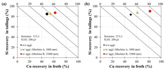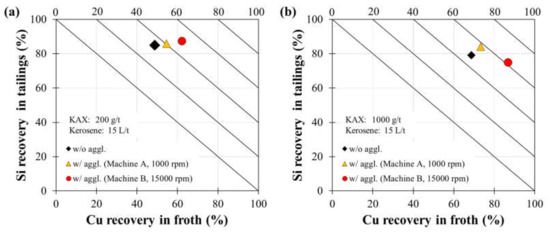 Figure 9 shows the relationship between Cu recovery in froth, RCu (%), and Si recovery in tailings, RSi (%), after agglomeration-flotation under the following conditions: kerosene dosage, 15 L kerosene/t sample; agglomeration time, 30 min; agitation strength, 1000 rpm and 15,000 rpm; KAX dosage, 200g/t and 1000 g/t. In the case of flotation without agglomeration (i.e., control), flotation was conducted after conditioning with KAX and 25 μL/L of frother.