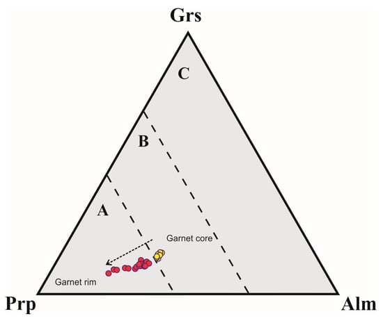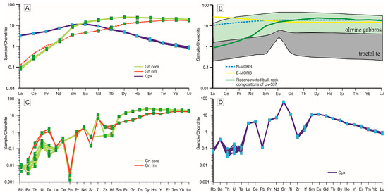 - Griffin, W.L.; Smith, D.; Boyd, F.R.; Cousens, D.R.; Ryan, C.G.; Sie, S.H.; Suter, G.F. Trace-element zoning in garnets from sheared mantle xenoliths. Geochim. Cosmochim. Acta 1989, 53, 561–567. [Google Scholar] [CrossRef]