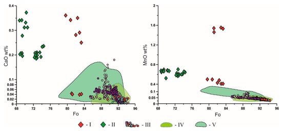 - Sobolev, N.V.; Logvinova, A.M.; Zedgenizov, D.A.; Pokhilenko, N.P.; Malygina, E.V.; Kuzmin, D.V.; Sobolev, A.V. Petrogenetic significance of minor elements in olivines from diamonds and peridotite xenoliths from kimberlites of Yakutia. Lithos 2009, 112, 701–713. [Google Scholar] [CrossRef]