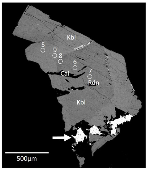 SEM-BSE image (maximum contrast) of a polished section of a kesebolite-(Ce) crystal (Kbl). Patches of rhodonite (Rdn) and manganoan calcite (Cal) occur as inclusions in kesebolite-(Ce); the white arrow points to an intergrowth between gasparite-(Ce) and a possible Mn-analogue to cerite-(Ce). Numbered rings refer to areas of selected point analyses (Tables 2 and 3).